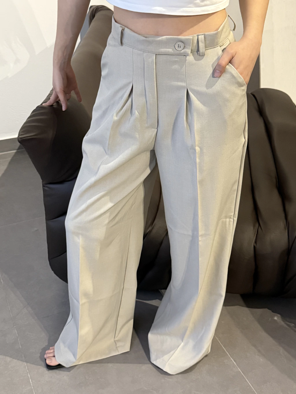 Pantalón sastrero, tiro alto, con pretina extendida. Lleva bolsillos en los costados y bolsillos traseros.